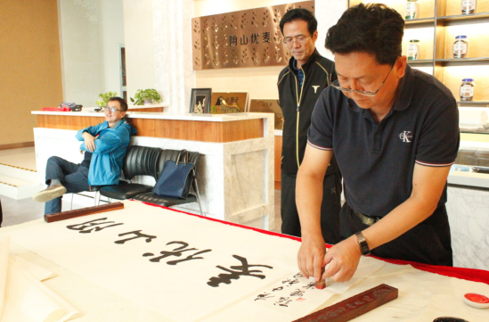 隨后,大家又來(lái)到燕麥博物館,感受燕麥文化、體驗(yàn)燕麥產(chǎn)品的同時(shí),并現(xiàn)場(chǎng)目睹書(shū)法名家張曉華老師的揮毫潑墨。孟才介紹,中國(guó)燕麥的市場(chǎng)份額在100億元以上,裸燕麥起源于中國(guó),但是國(guó)內(nèi)燕麥深加工所用的原糧90%是進(jìn)口皮燕麥,只有10%是國(guó)產(chǎn)裸燕麥,主要原因是國(guó)產(chǎn)裸燕麥多采用傳統(tǒng)旱作耕作方式,人工除草,有機(jī)種植,不使用除草劑、農(nóng)藥、化肥等,畝產(chǎn)較低。但是,也正因如此裸燕麥的口感更好、質(zhì)量更佳且蛋白質(zhì)、脂肪、β-葡聚糖等營(yíng)養(yǎng)成分均高于皮燕麥。得天獨(dú)厚的資源優(yōu)勢(shì)是陰山優(yōu)麥建企立身的根基和市場(chǎng)競(jìng)爭(zhēng)的底氣,產(chǎn)品全部采用優(yōu)質(zhì)的國(guó)產(chǎn)裸燕麥就是陰山優(yōu)麥的核心競(jìng)爭(zhēng)力!