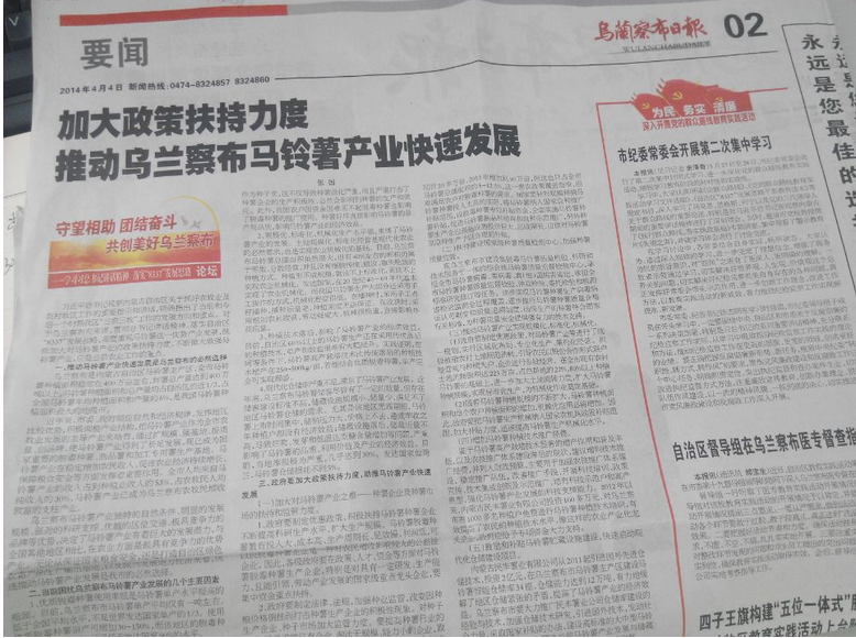 4月4日,烏蘭察布日?qǐng)?bào)發(fā)表內(nèi)蒙古民豐薯業(yè)有限公司總經(jīng)理張國關(guān)于《加大政策扶持力度,助推馬鈴薯產(chǎn)業(yè)快速發(fā)展》的文章,文章指出: